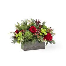 This stunning bouquet is handcrafted to bring the cozy feel of the holidays into your home. An array of red roses, green button pompons, and seeded eucalyptus.