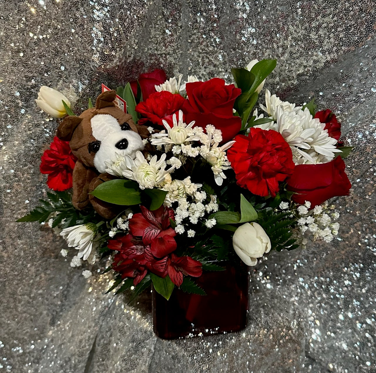 Red Glass Cube with red roses, white tulips, red alstromeria, red carnations, white cushion poms, baby's breath and an adorable Bull Dog Beanie plush