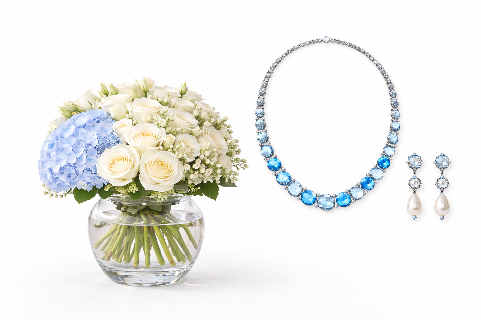 A fresh coastal - inspired Valentine's gift that blends soft florals with subtle sparkle. Includes blue hydrangea and white roses in a clear glass vase and Sorrelli fine jewelry earrings for Standard pricing